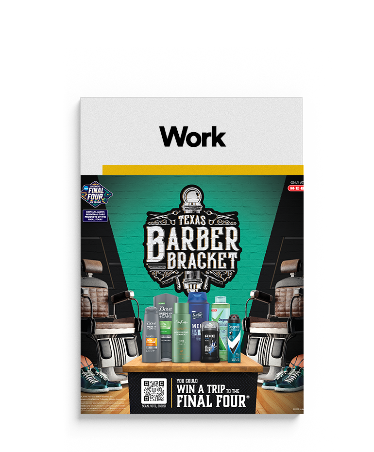 To round out our NCAA celebration, we also took our 2022 H-E-B Texas Barber Bracket and made it even bigger for 2023—continuing to support the trade school community by championing student barbers. The bracket-style challenge culminated with the Final Four student barbers appearing at a pop-up event at a Houston H-E-B during Final Four weekend. Shoppers got a spin in the barber chair as the student barbers competed for a grant to help further their career and education.
