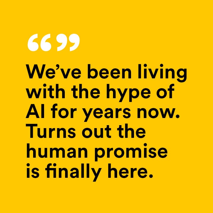 As marketers, we’ve been living with the hype of AI for years now. We’re amazed by its potential. Ready for it to take away our busy work. And hopeful that it will truly accelerate our thinking and improve the brand experiences we create. Turns out the human promise of AI is finally here.