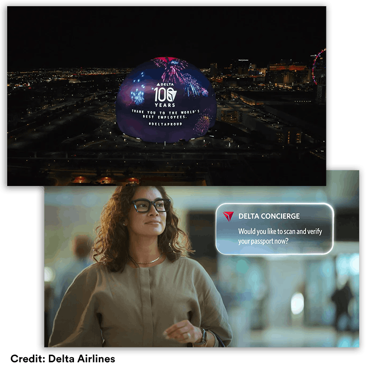 Delta Airlines understands this in a big way. So big they took over The Sphere to celebrate their 100th birthday and lay out a vision for the future of air travel. With an ongoing purpose to bring people together, they’ve focused their AI efforts on removing any barrier to that vision. This includes the launch of Delta Concierge, a generative AI assistant built into the Delta app and designed to use personal data to make the flying experience more delightful. From knowing your preferences, to reminding you to renew your passport, to recommending the best route to the airport (including a new air taxi partnership with Joby), Delta is anticipating every need before you ever have to ask.